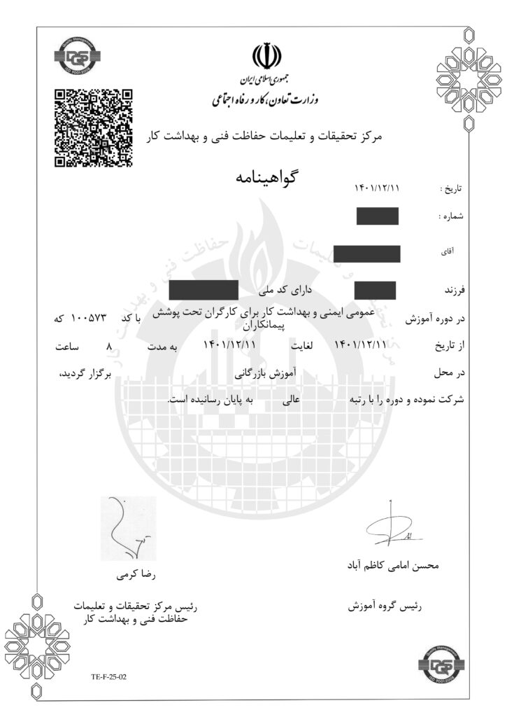 این دوره زیر نظر مرکز تحقیقات و تعلیمات حفاظت فنی و بهداشت کار برگزار میگردد و جز مدارک مورد نیاز جهت اخذ مجوز صلاحیت ایمنی میباشد. مدت دوره: یک روزه به مدت ۸ ساعت گروه هدف: تمام پرسنل، مطابق آخرین لیست بیمه تأمین اجتماعی هدف برگزاری کلاس: افزایش دانش و مهارت کارگران جهت کاهش مخاطرات در محیط کار