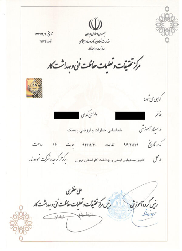 نمونه گواهی دوره شناسایی خطرات و ارزیابی ریسک